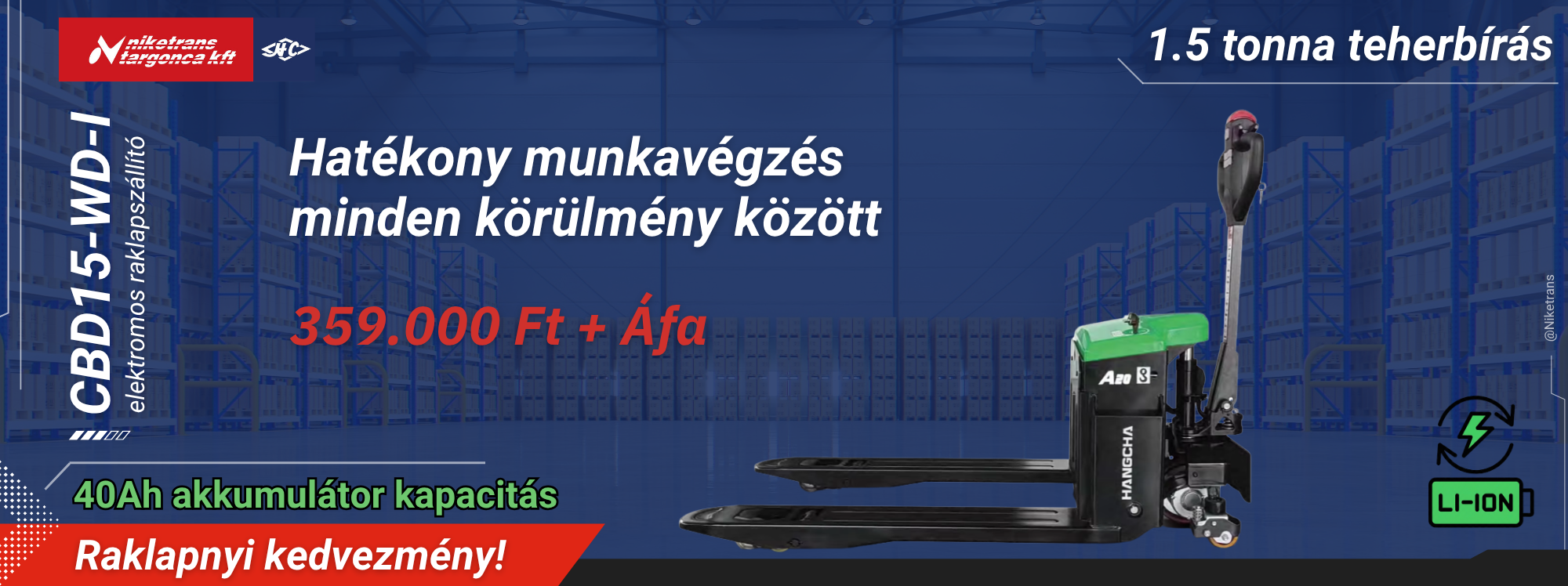 Az elektromos raklapszállító ma már nélkülözhetetlen eszköz minden korszerű raktárban, logisztikai központban és üzletben. Ha megbízható, modern és gazdaságos megoldást keres raklapos áruk mozgatásához, a Hangcha CBD15-WS elektromos raklapszállító pontosan az, amire szüksége van - most pedig különleges, raklapnyi kedvezménnyel juthat hozzá!