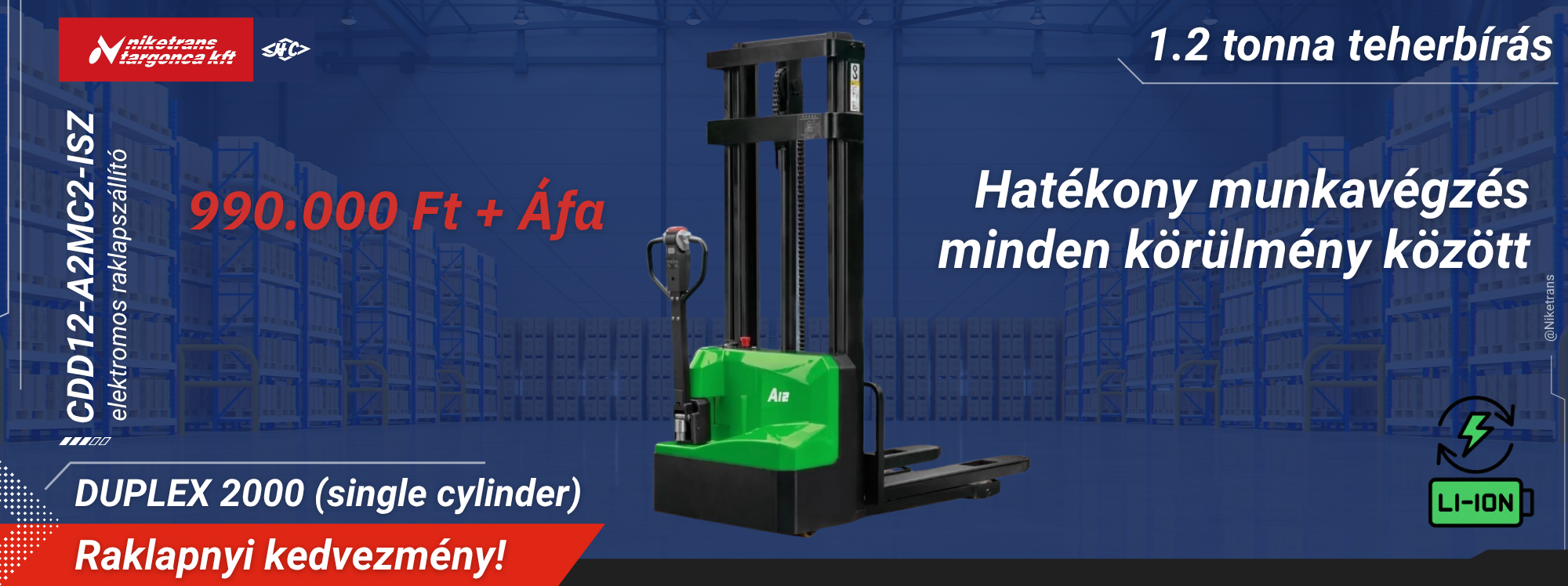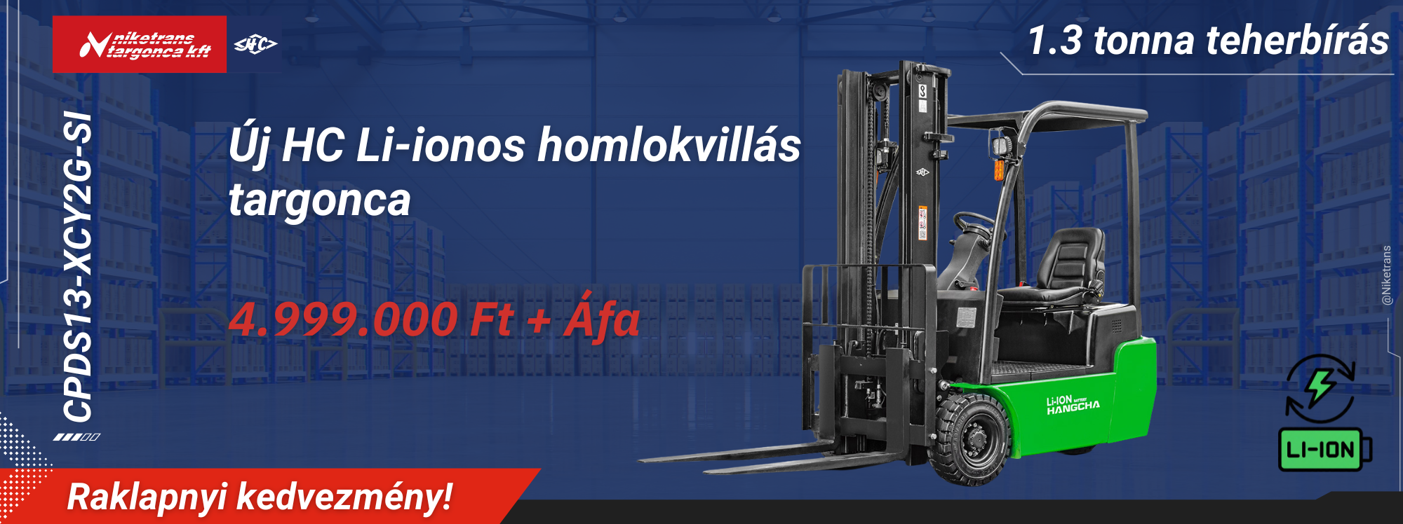 Készletkisöprés a Niketrans-nál! Hangcha CPDS13-XCY2G-SI elektromos homlokvillás targonca, 1,3 tonna teherbírással, duplex emelőtoronnyal, integrált oldalmozgatással és beépített EVE Li-ion akkumulátorral – most 4.999.000 Ft+ÁFA!
