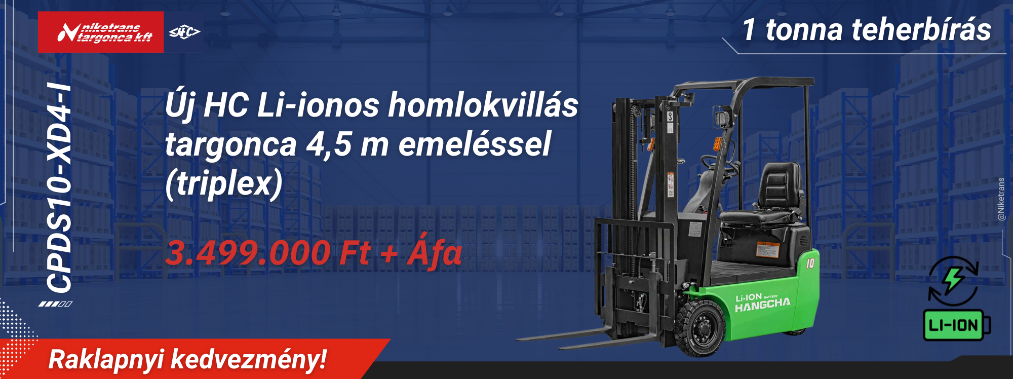 Készletkisöprő akció a Niketrans-nál! Hangcha CPDS10-XD4 elektromos homlokvillás targonca, 1 tonna teherbírással, triplex emelőtoronnyal, 4500 mm emelési magassággal és beépített CATL Li-ion akkumulátorral – most 3.499.000 Ft+ÁFA!