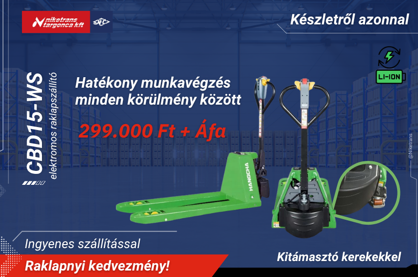 Az elektromos raklapszállító ma már nélkülözhetetlen eszköz minden korszerű raktárban, logisztikai központban és üzletben. Ha megbízható, modern és gazdaságos megoldást keres raklapos áruk mozgatásához, a Hangcha CBD15-WS elektromos raklapszállító pontosan az, amire szüksége van - most pedig különleges, raklapnyi kedvezménnyel juthat hozzá!