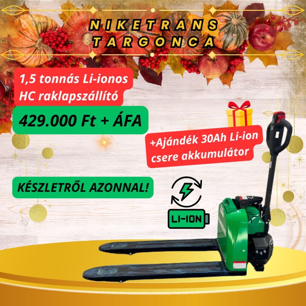 Novemberi rakodási lendület! HC Li-ionos homlokvillás targonca 4.990.000 Ft+ÁFA + ajándék kézi raklapemelő!