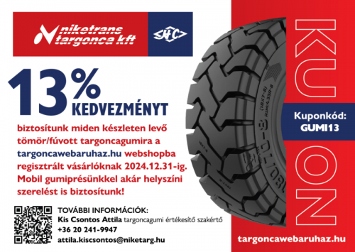 Most még jobban megéri regisztrálni, mivel készleten lévő tömör és fúvott gumiabroncsainkra 13% engedményt adunk minden, a webáruházunkba regisztrált vásárlónknak egész évben, 2024. december 31-ig: